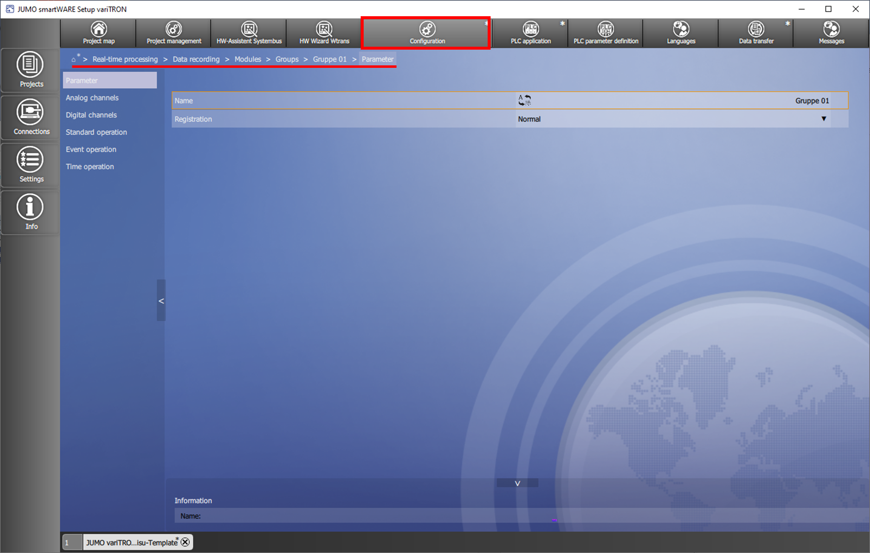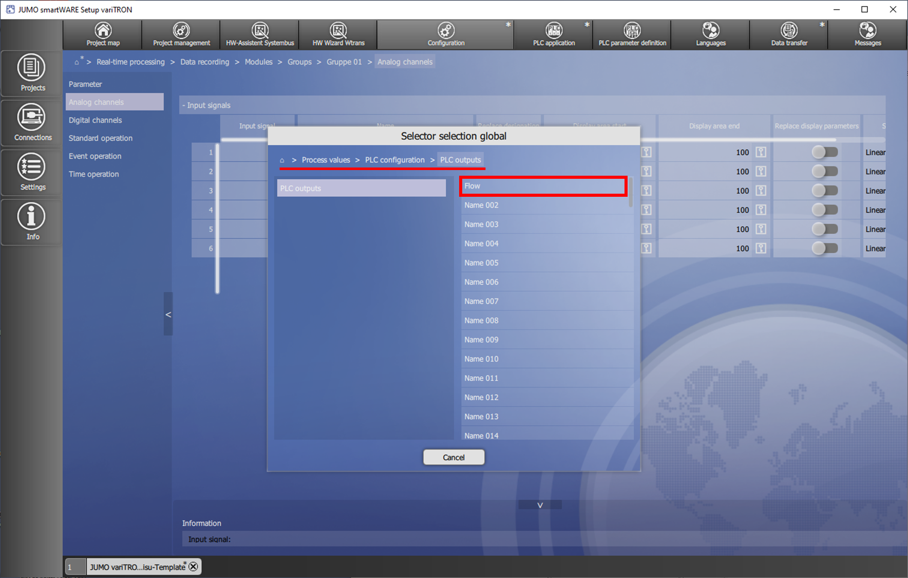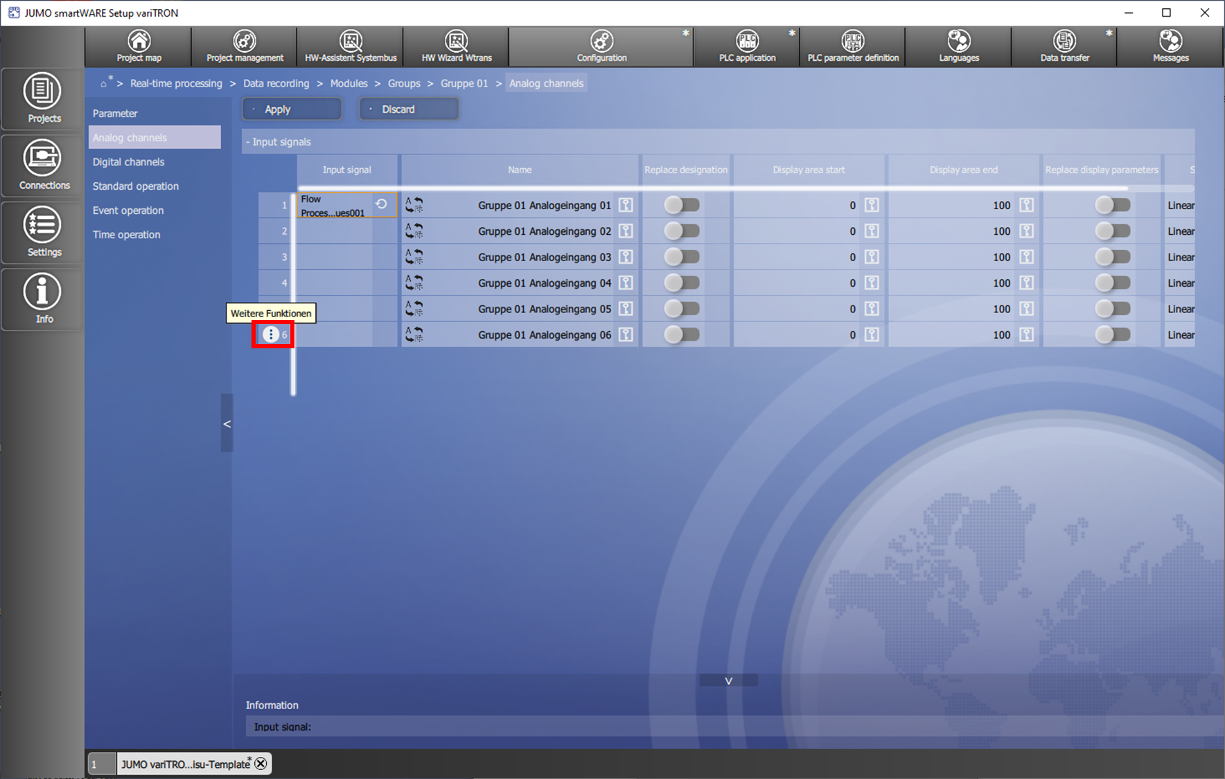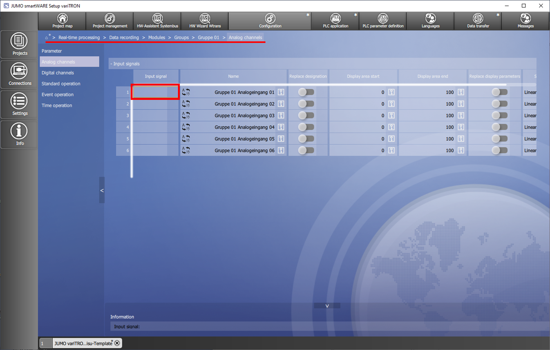 Unter :Haus: > PLC configuration > Real-time processing > Data recording > Modules > Groups > Gruppe 01 > Analog channels können Analogvariablen auf die Analogeingänge der Gruppe verbunden werden. Hierfür muss das rot markierte Feld für Input signal angeklickt werden.