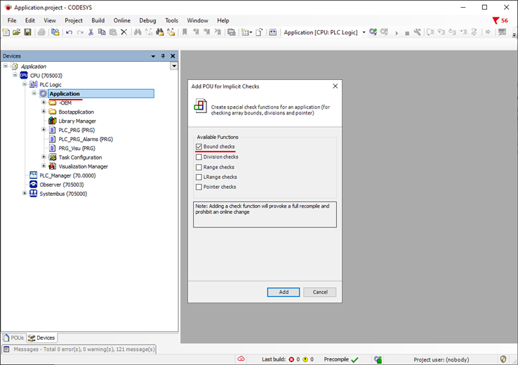 Es gibt verschiedene Hilfsmittel, um den eigenen SPS-Code auf Fehler zu überprüfen. Eine der Möglichkeiten ist, die von CODESYS zur Verfügung gestellten implizite Überwachungsfunktionen in das Programm zu implementieren. Diese Funktionen überprüfen während der Laufzeit die Grenzen von Arrays oder Unterbereichstypen, die Gültigkeit von Pointeradressen oder eine Division durch Null.