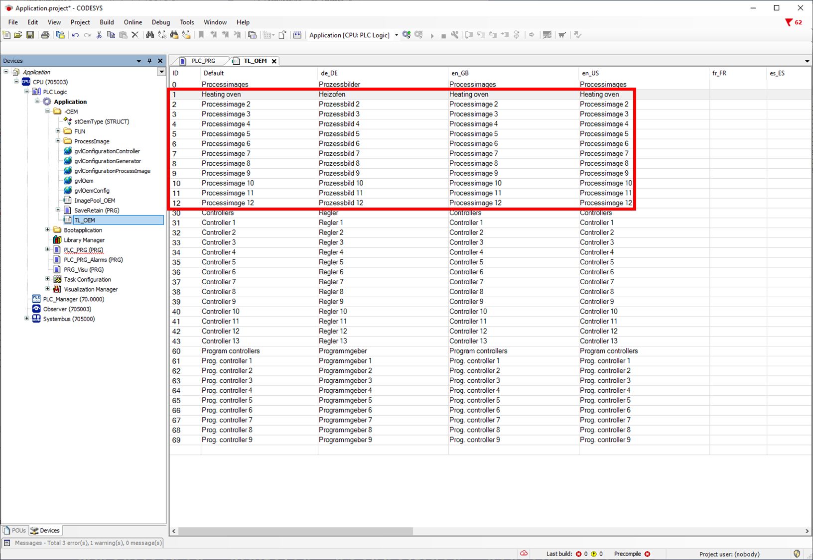 Im CODESYS Projekt befindet sich im OEM Ordner die Textliste TL_OEM. Hier sind die Namen von zwölf Prozessbildern vordefiniert. Diese können nach Bedarf angepasst werden. Für jedes Prozessbild kann der Name auch in weiteren Sprachen vorgegeben werden, was bei der Sprachumschaltung benötigt wird.