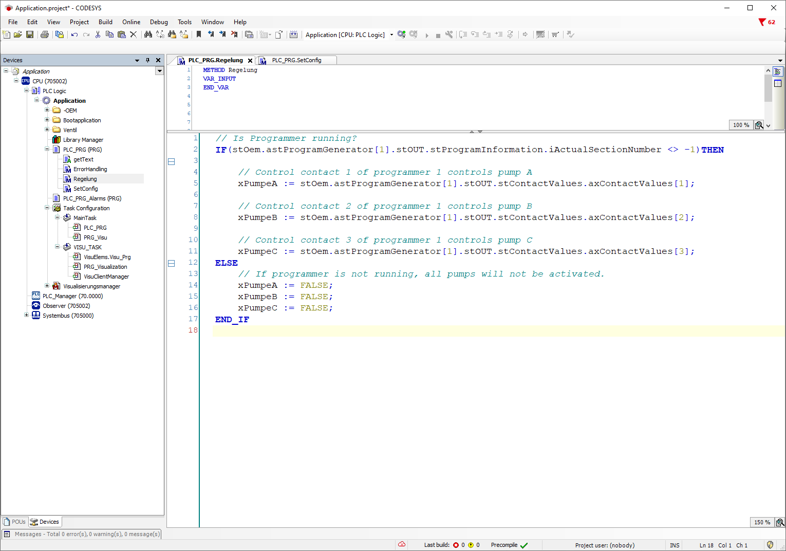 In diesem Beispiel werden die ersten drei Steuerkontakte des Programmgeber 1 ausgewertet und damit drei unterschiedliche Pumpen angesteuert. Voraussetzung ist, dass der Programmgeber läuft (Abfrage in Zeile 2). Läuft der Programmgeber nicht, dann werden die Pumpen nicht angesteuert (false).