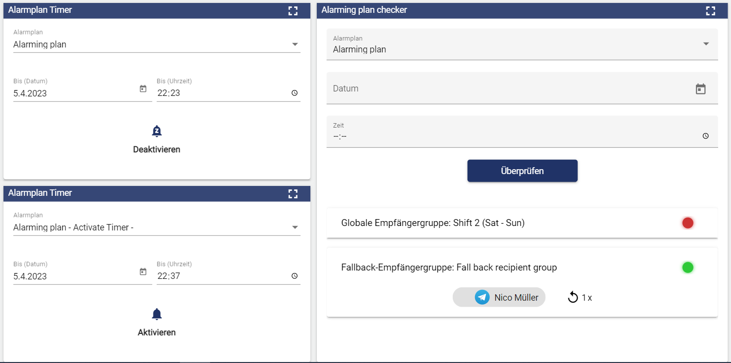 Mit dem Widget: Alarmplan Prüfer kann überprüft werden, ob ein Alarmplan zu einem bestimmten Zeitpunkt aktiviert ist und ob die dazugehörigen Empfängergruppen richtig eingestellt sind.