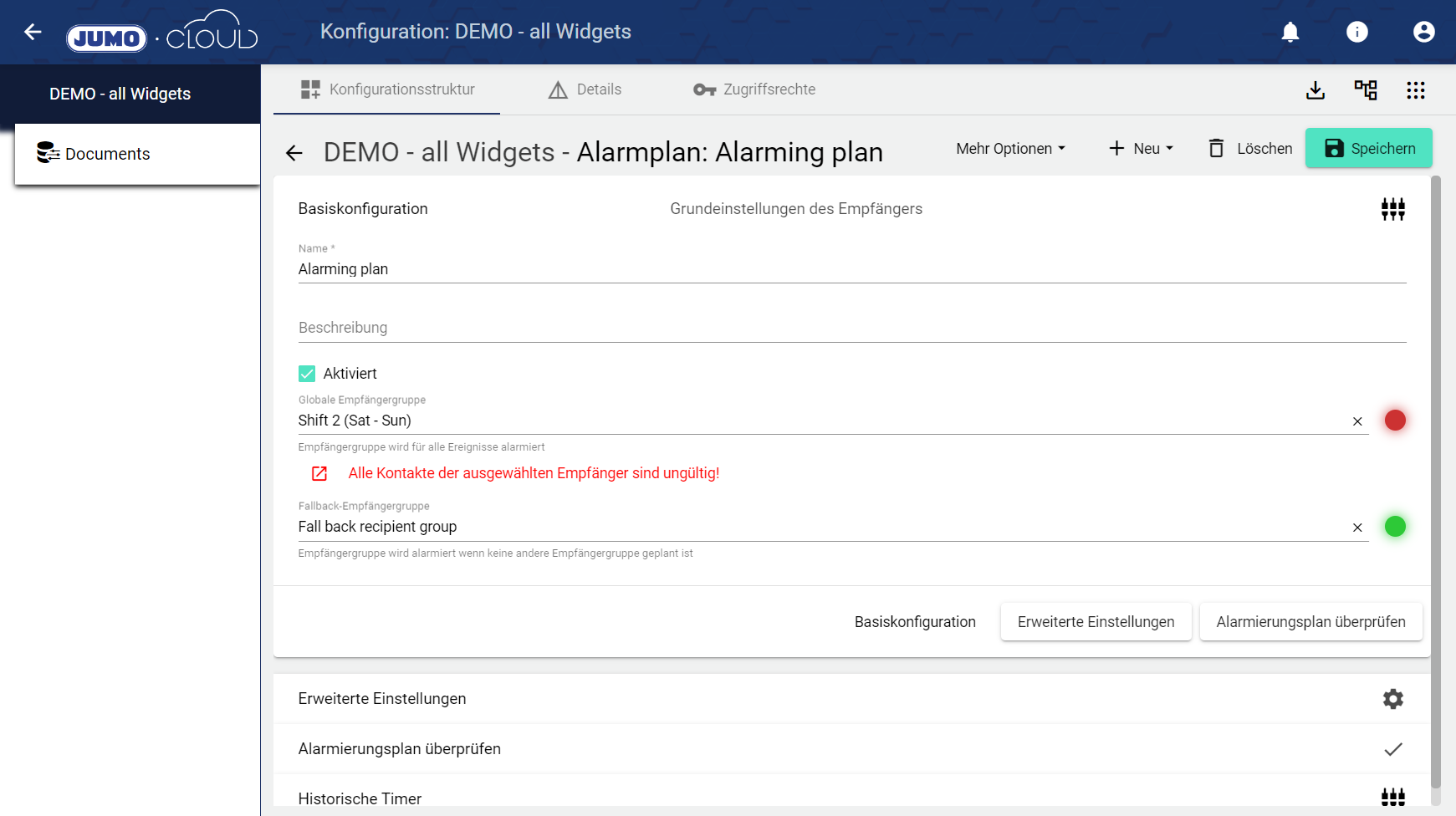 3.b) Zusätzlich zu den bereits in 3.a) erwähnten Widgets gibt es entsprechende Ergänzungen in der Konfiguration des Alarmplans. So kann nun ab sofort erkannt werden, ob alle Einstellungen, z. B. in der verknüpften Empfängergruppe, korrekt getätigt wurden. Wie auch im Widget kann der Alarmplan bei der Konfiguration nach Datum überprüft werden. Wurde der Alarmplan mittels “Widget: Alarmplan Timer” deaktiviert bzw. aktiviert, lässt sich dies im Reiter “Historischer Timer” einsehen.