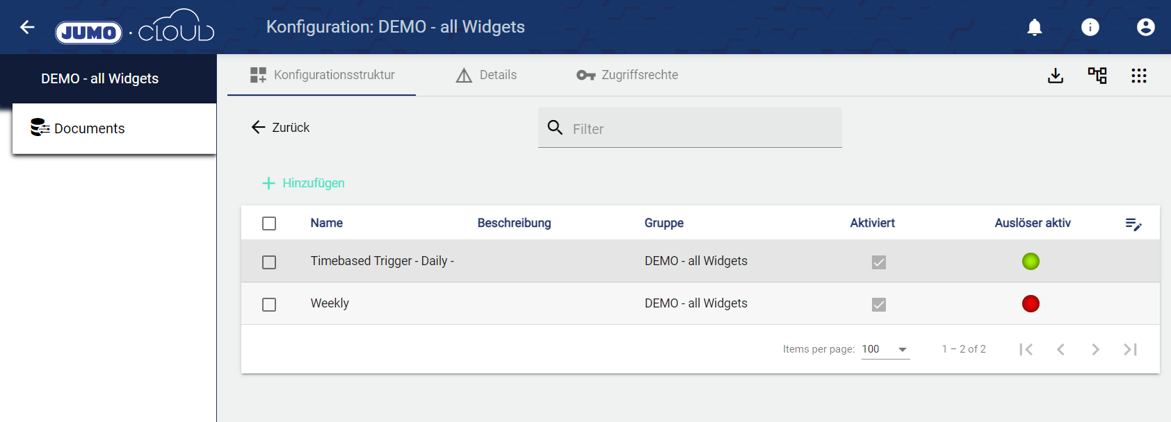 Die Spalte “Auslöser Aktiv” kann über die Tabellen-Editierung oben rechts aktiviert werden.