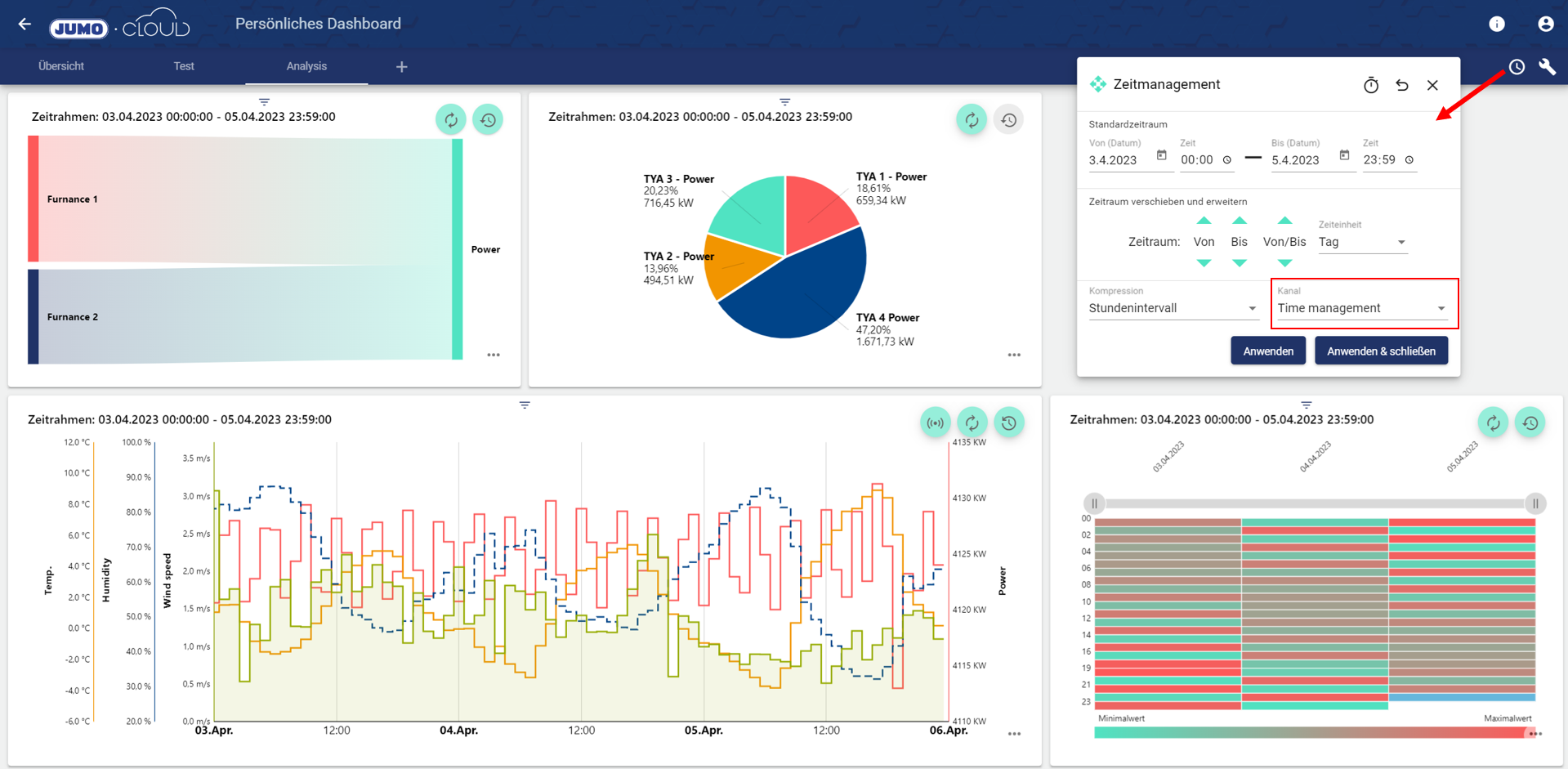12.) Die zentrale Zeitsteuerung wurde überarbeitet und optimiert. Nun lässt sich mit dem bekannten “Zeitmanagement” ein Kanal auswählen, um alle gewünschten Widgets: Analysis zu steuern. Im unteren Beispiel wurde mit einem Klick die Zeitspanne aller Widgets gesetzt. Somit kann der Zeitbereich vom 03.04. bis 05.04 einfach und schnell ausgewertet werden.