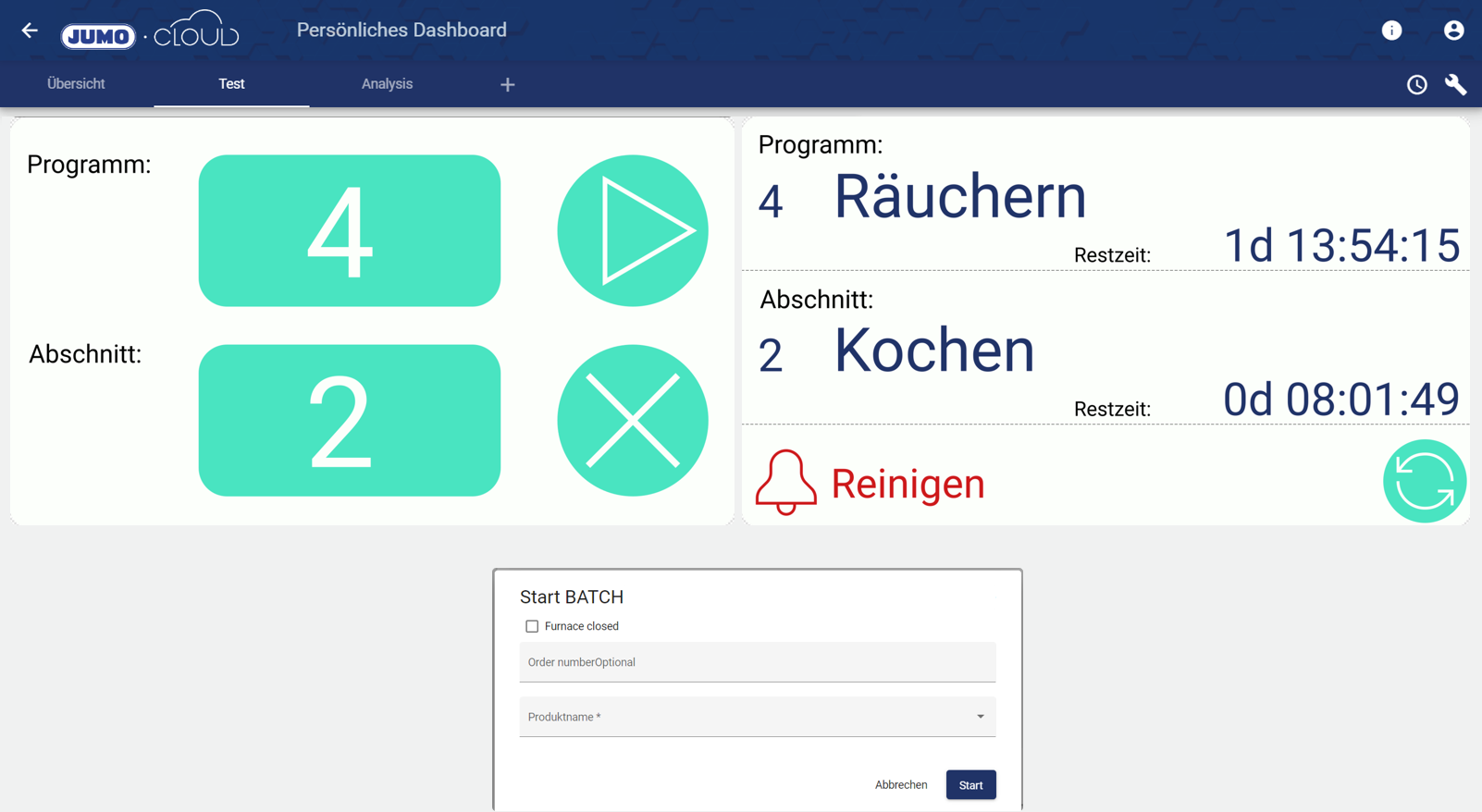 Ein Programm lässt sich über die Cloud mittels Prozessbild auswählen und erst dann starten, wenn die Chargendaten im “Start Batch”-Feld korrekt eingegeben wurden.