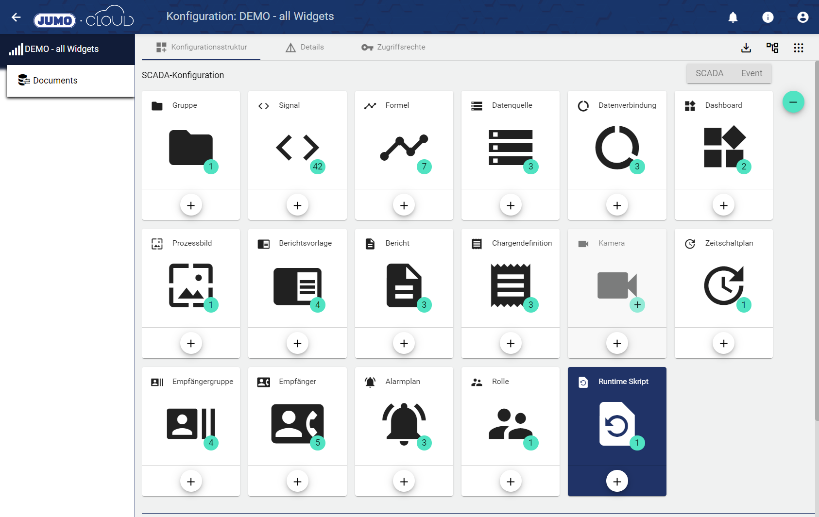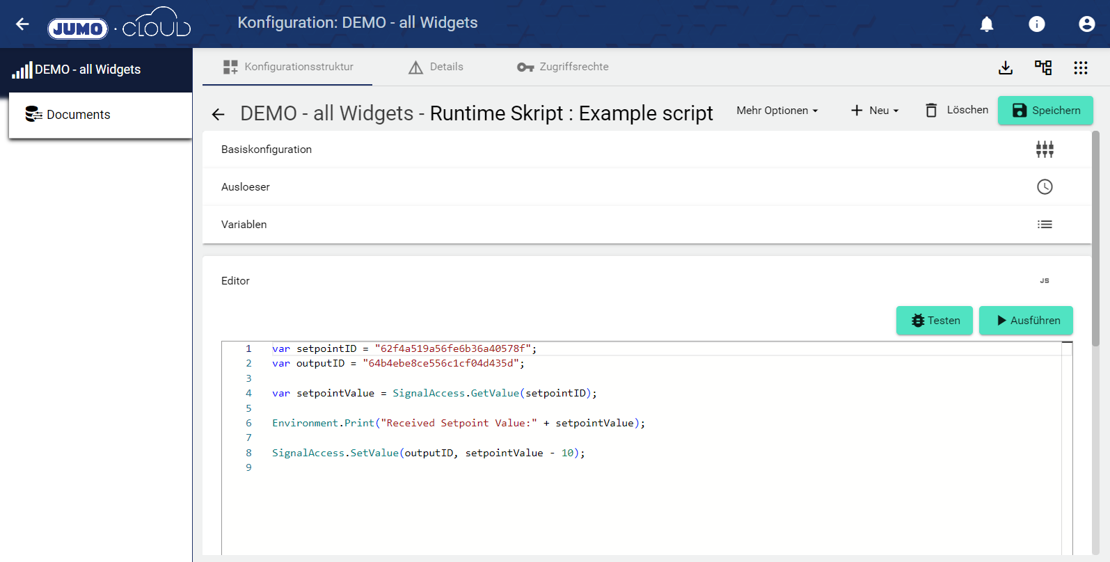 2.) Ab diesem Release kann die JUMO Cloud Programmcode auslöserbasiert ausführen und damit auch komplexere Automatisierungsaufgaben lösen. Hierzu wurde in der Konfiguration eines jeden Mandanten die Runtime Skript-Funktion ergänzt. Hiermit können z. B. Signalwerte abgefragt, Sollwerte ereignisbasiert gesetzt, ein Chargenstart bzw. -stopp realisiert oder ein Kamerabild ins Archiv übernommen werden. Ebenso kann per Skript überprüft werden, ob in einem bestimmten Zeitraum ein Kamerabild im Archiv vorhanden ist.