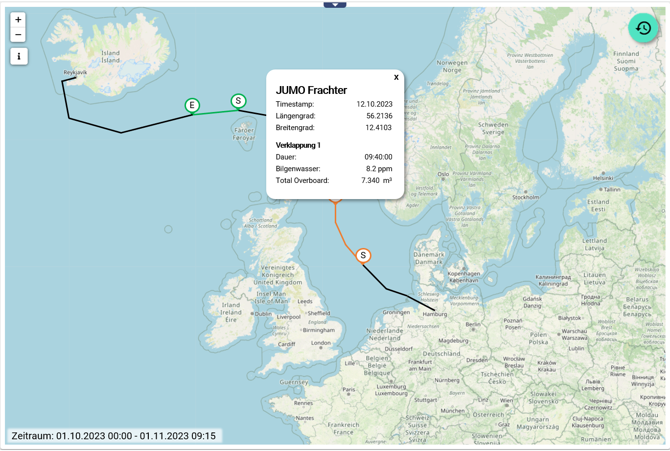 1.) Mit dem brandneuen Widget: Ereignispfadkarte kann ab sofort die Bewegungshistorie von Objekten auf der Landkarte dargestellt und analysiert werden. Zusätzlich können Signalwerte ereignisbasiert bei Ereignis-Start S und Ereignis-Ende E festgehalten werden. Zudem wird dieser Ereignis-Verlauf auf der Karte farblich hervorgehoben. So lässt sich beispielsweise der Ablauf der Bilgenwasserentsorgung (Verklappung) je Schiff lückenlos abbilden und nachweisen.