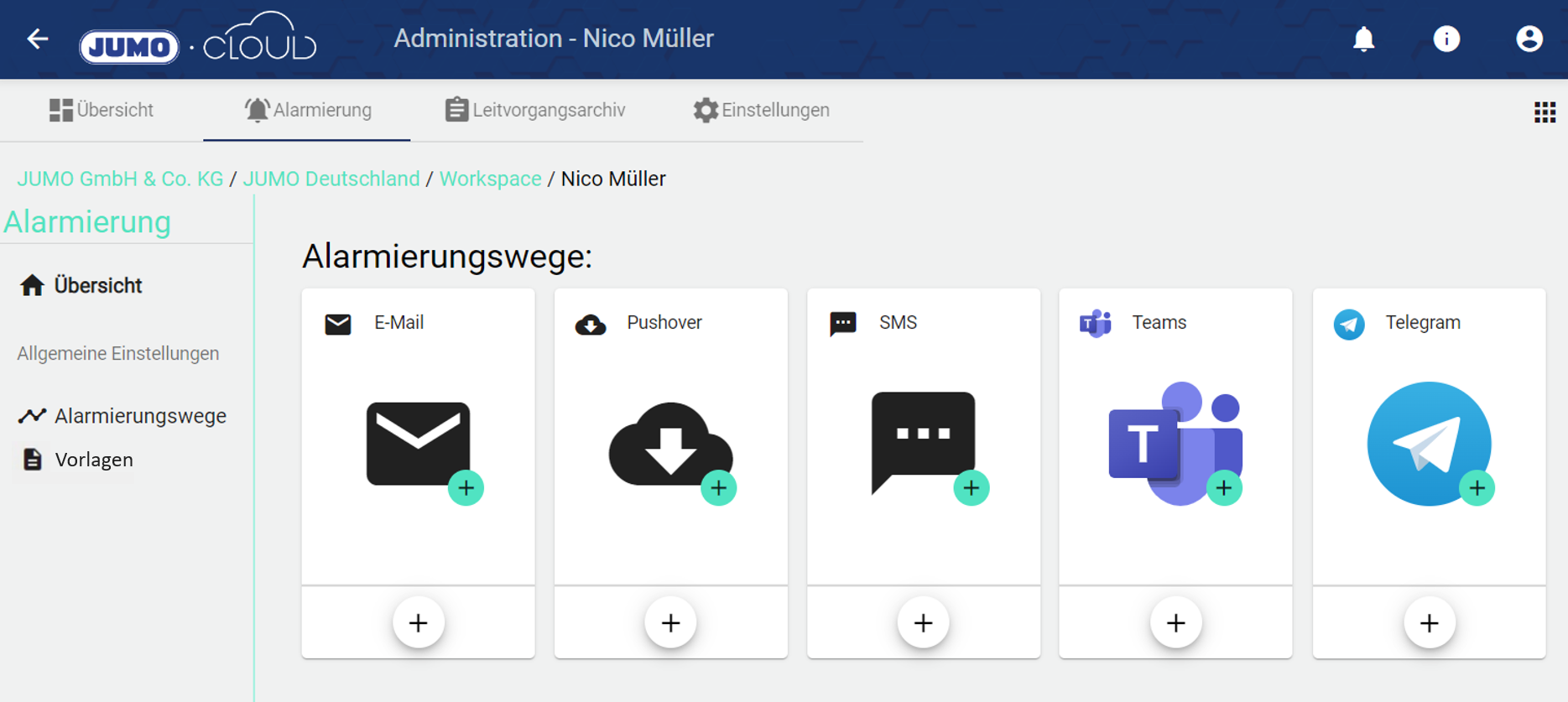 5.) Benutzerdefinierte Alarmierungsdienste können nun innerhalb der Administration eines Mandanten unter “Alarmierung” konfiguriert werden. Optional kann der eingestellte Dienst auch an Sub-Mandanten vererbt werden.