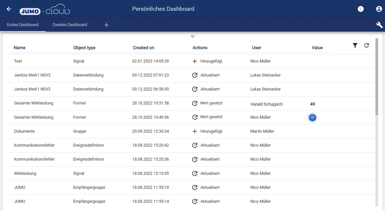 Wird über eines der Signale gehovert, erscheinen beim Signalwert der Zeitstempel und rechts in der Zeile ein Symbol. Durch ein Klick aus dieses, wird die Signalhistorie als historisches Diagramm angezeigt.