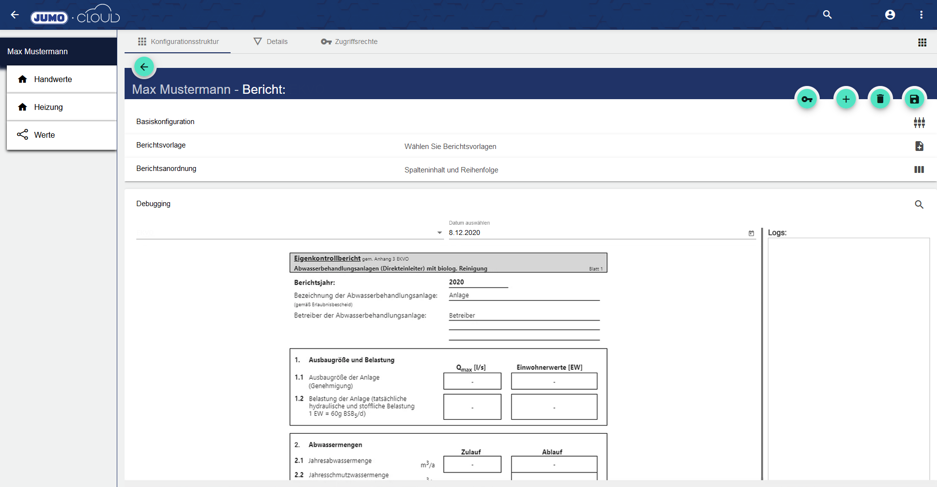 Damit können Sie die gewünschte Berichtsvorlage aus den zuvor festgelegten Vorlagen auswählen und diese in dem darunterliegenden Debug-Vorschau anzeigen lassen. Außerdem werden Fehlermeldungen in den Logs angezeigt. Um die Daten für einen bestimmten Tag, Monat oder Jahr auszuwählen, können Sie über das Datum selektieren.