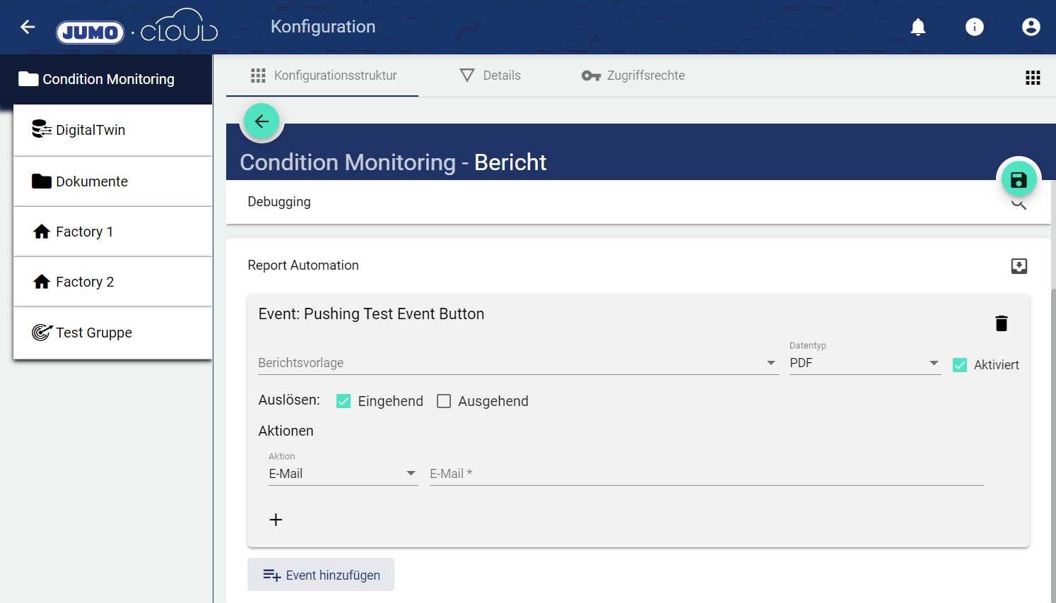 Über ein Ereignis ist es möglich den Bericht mit einer individuellen Berichtsvorlage per PDF oder CSV Datei via E-Mail zu versenden.