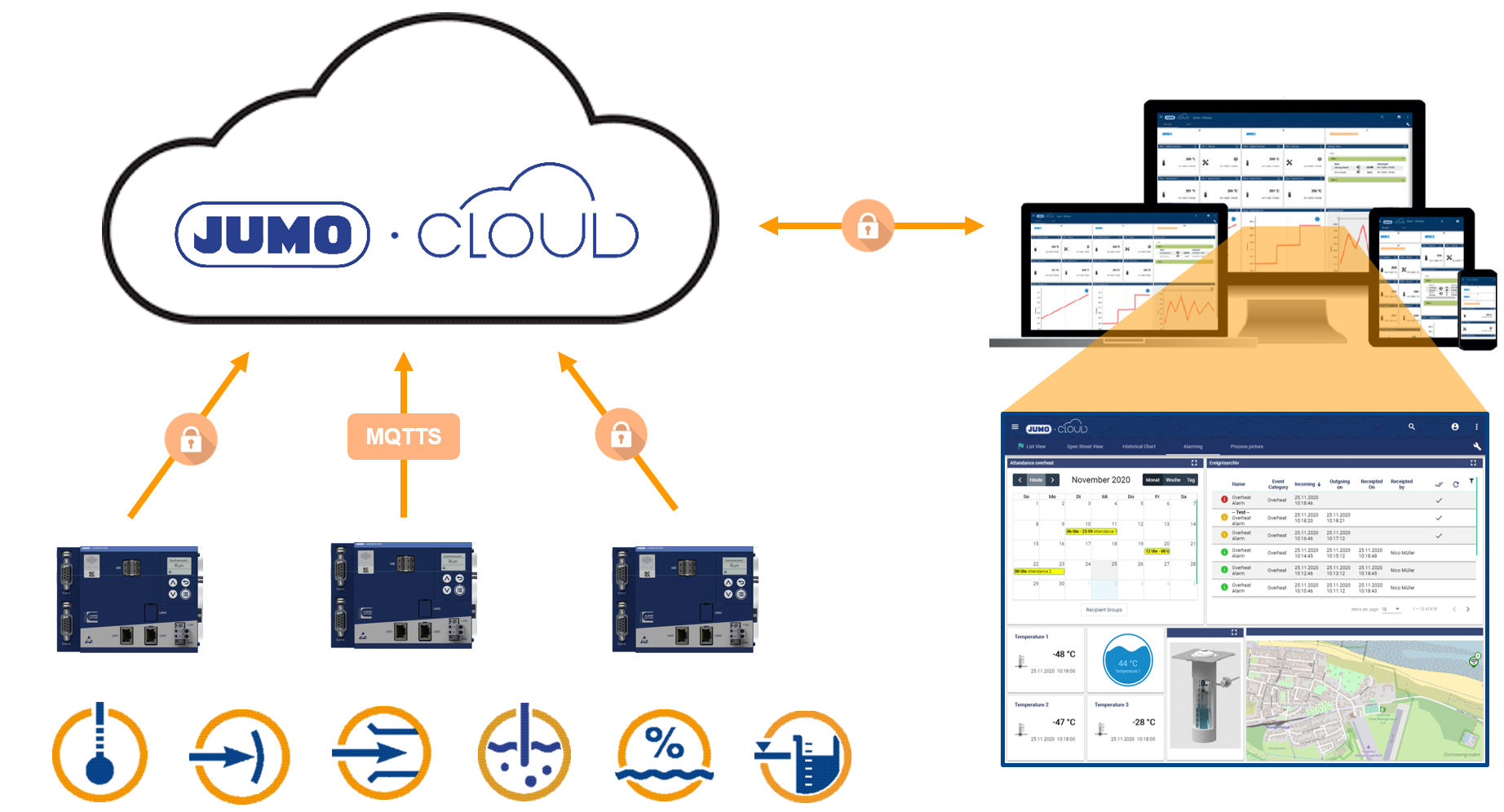 Mit der JUMO Cloud überwachen Sie Ihre Anlagen flexibel, Standort- und Infrastrukturunabhängig. Lediglich ein Internetzugang ist erforderlich,.