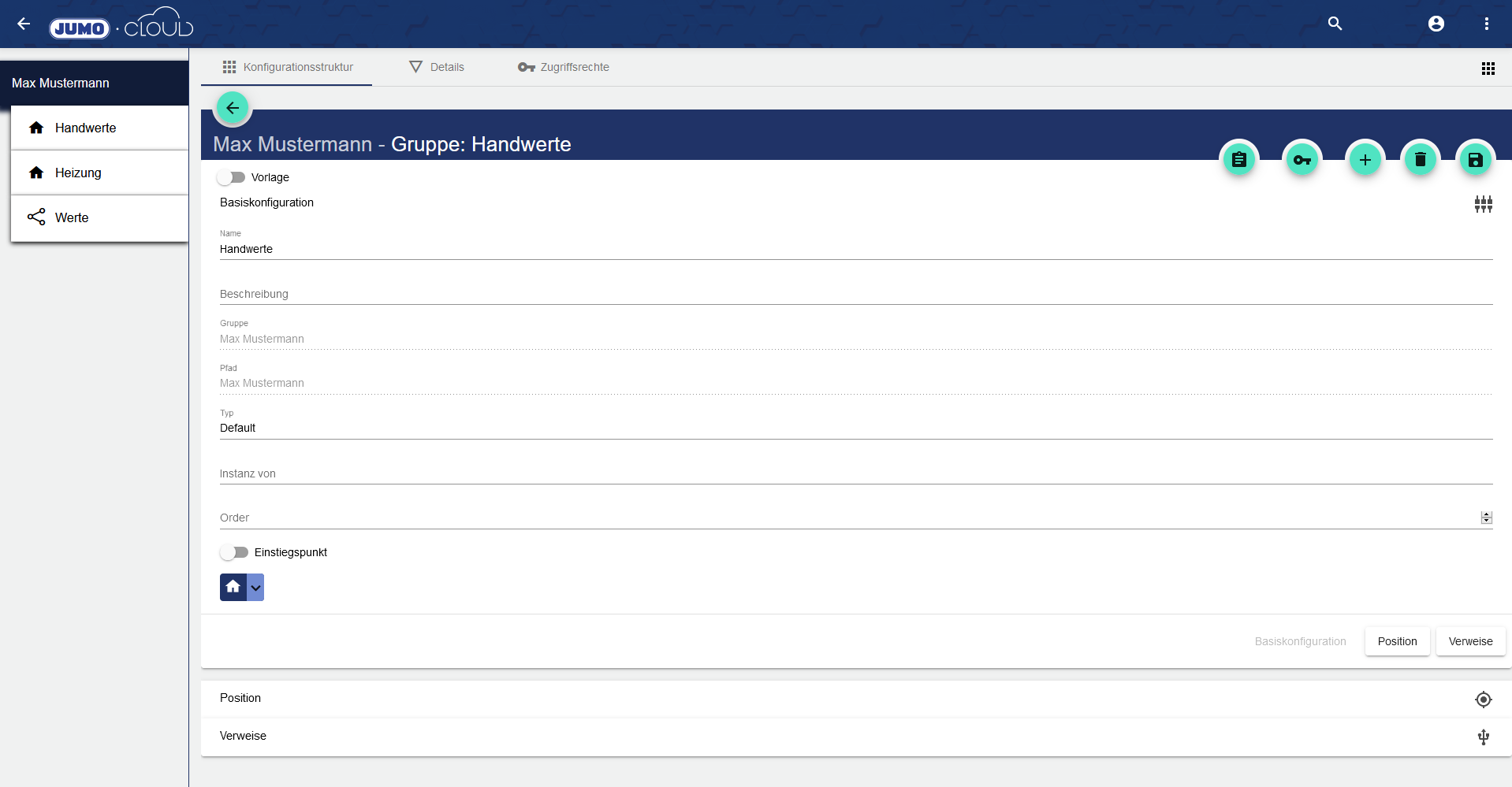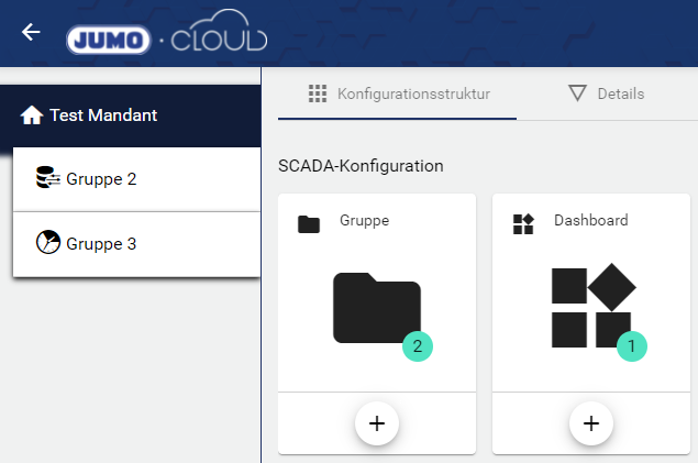 Eine Gruppe strukturiert den Mandanten. Die in der Konfiguration festgelegte Struktur gilt ebenso für Dashboards. Jede Gruppe beinhaltet alle Konfigurationselemente (Konfigurationsstruktur, Details, Zugriffsrechte)