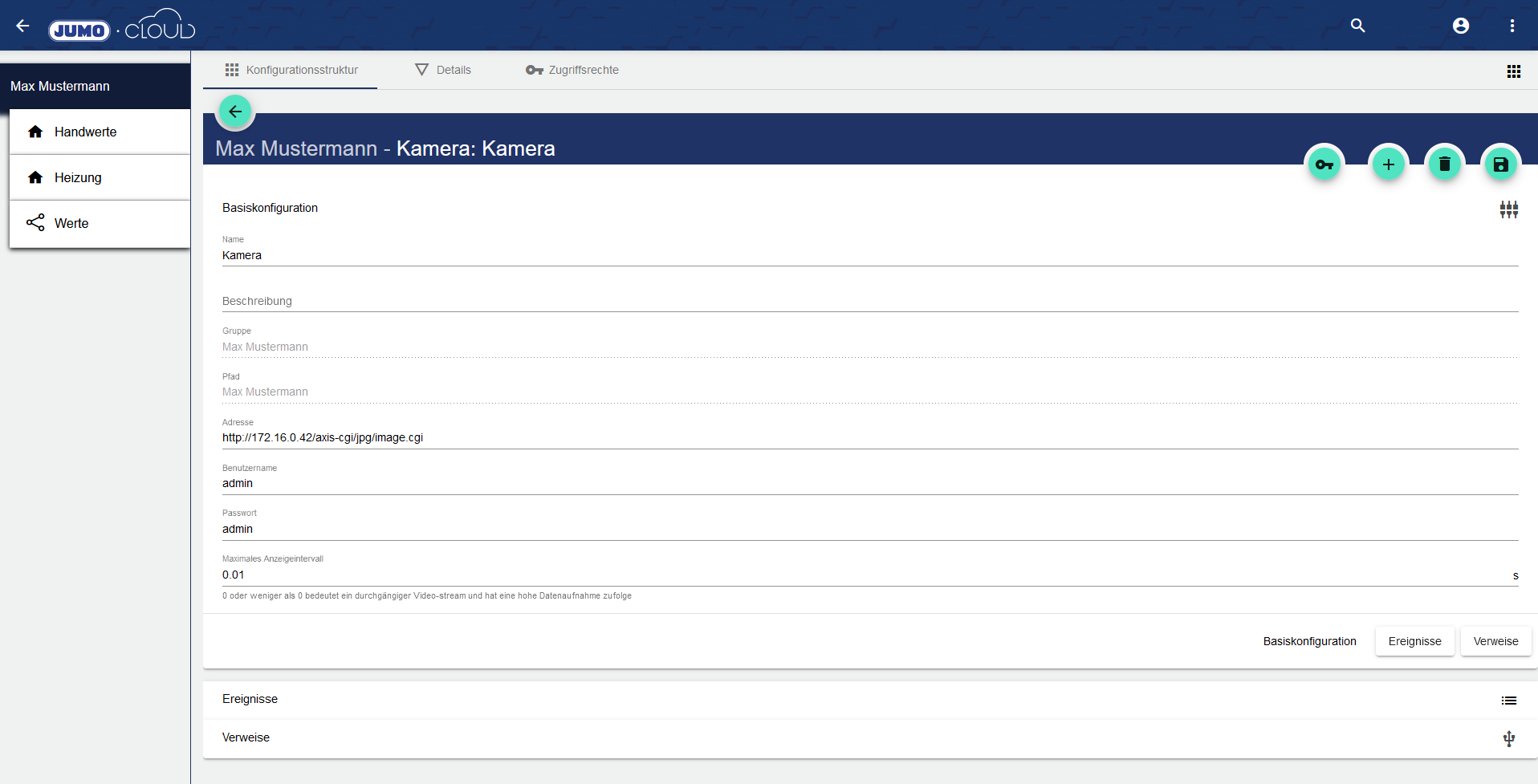 Über die Auswahl der Schaltfläche “Kamera” kann eine bereits angelegte Kamera bearbeitet werden. Über das Plus wird eine neue Kamera angelegt.