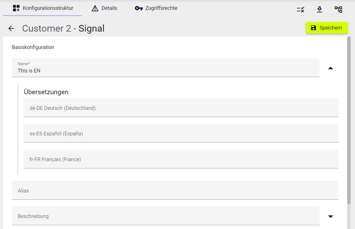 Beispiel: Wird die Sprachauswahl “Spanisch” im Benutzerprofil eines Users gewählt, werden hiernach die hinterlegten spanischen Signalbezeichnungen und -beschreibungen angezeigt.