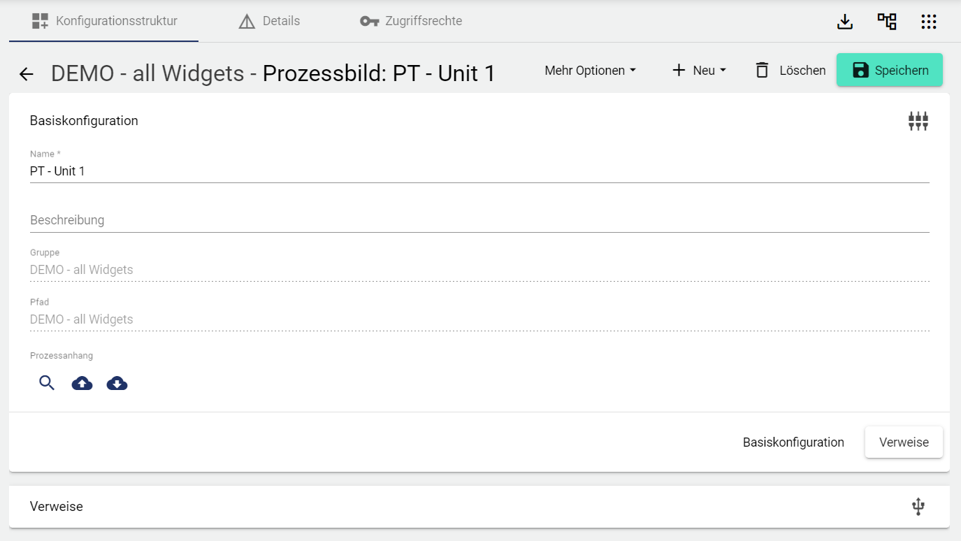 Name des Prozessbildes in der Basiskonfiguration vergeben. Das Feld Beschreibung ist optional nutzbar. Das Feld “Gruppe” zeigt, in welcher Gruppe das Prozessbild angelegt wurde. Der Pfad wird systemseitig automatisch generiert.