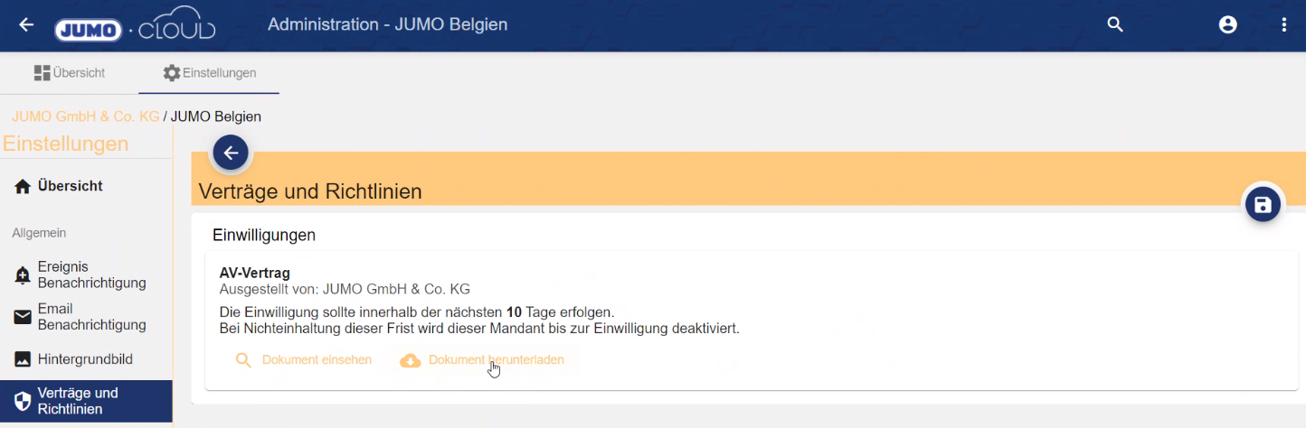 In der Administration des jeweiligen Mandanten unter Verträge und Richtlinien den JUMO Cloud AV unter Vertrag hinzufügen hochladen: