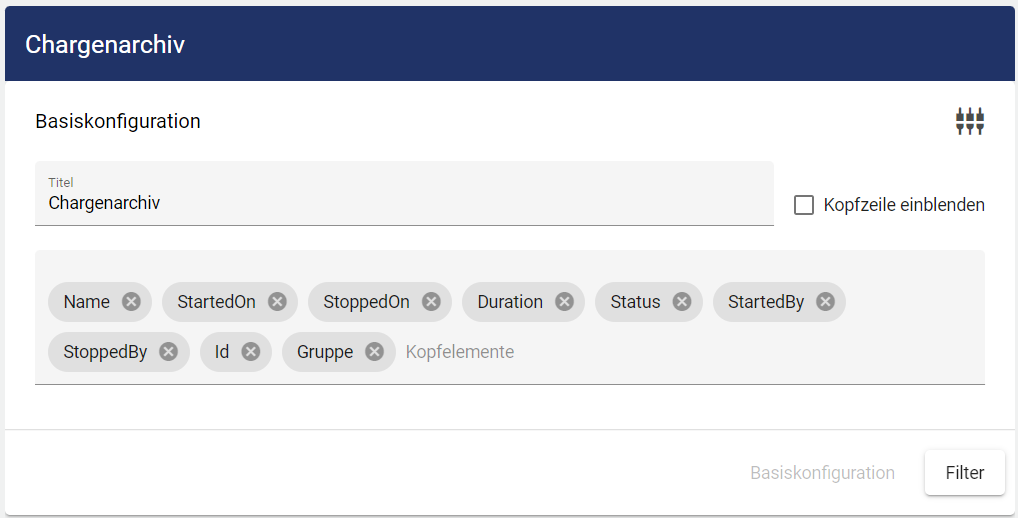 Als Kopfelement kann auch Freitext eingegeben werden (mit “Enter” abschließen). Wird hier die gleiche Bezeichnung wie ein Kopfdatenfeld aus der Chargendefinition eingetragen, wird dieses anschließend als Spalte im Widget angezeigt und kann auch gefiltert werden.