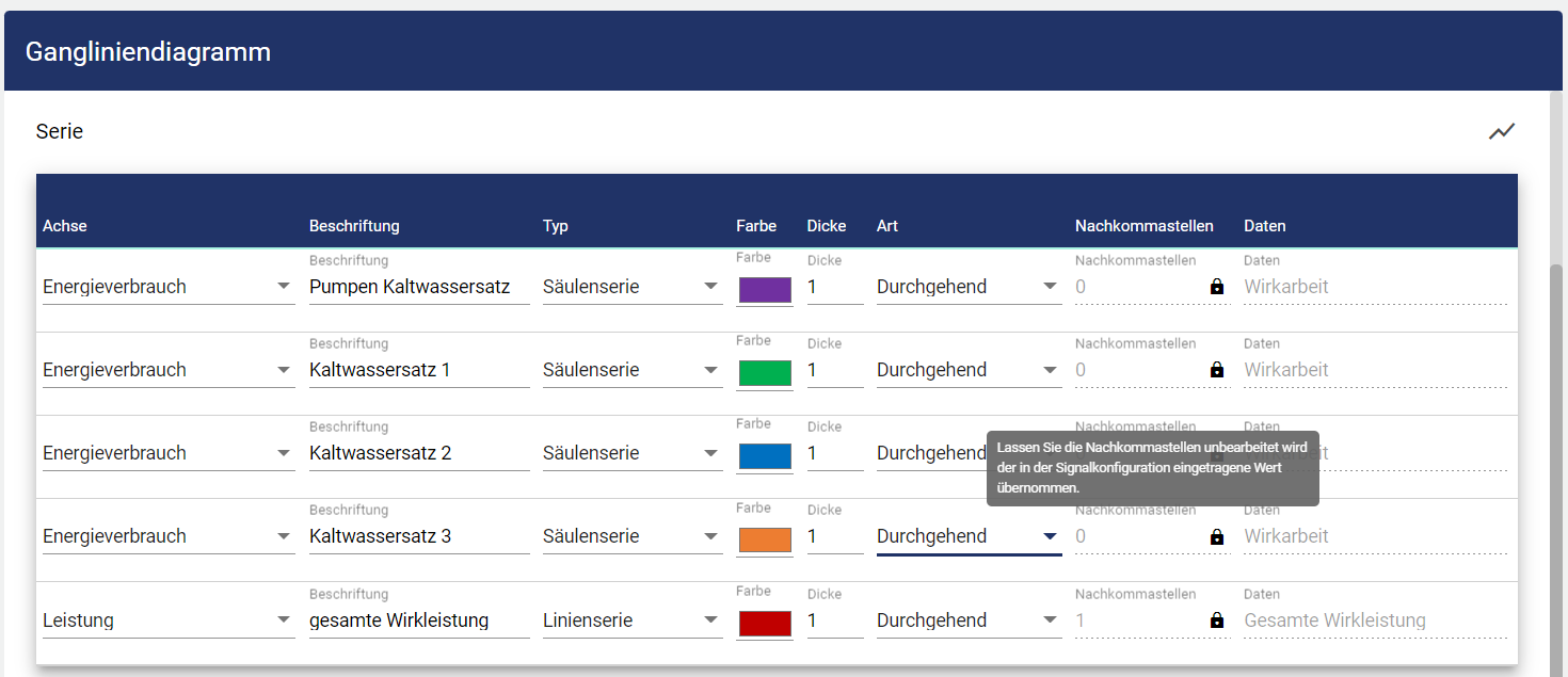 Für alle ausgewählten Datenpunkte wird automatisch eine Serie erstellt. Für jedes Signal, muss eine entsprechende Achse zugewiesen werden. Sie können weiterhin die Beschriftung, den Typ der Linie, die Farbe als auch die Dicke der Linie und die Nachkommastellen im Diagramm bestimmen.