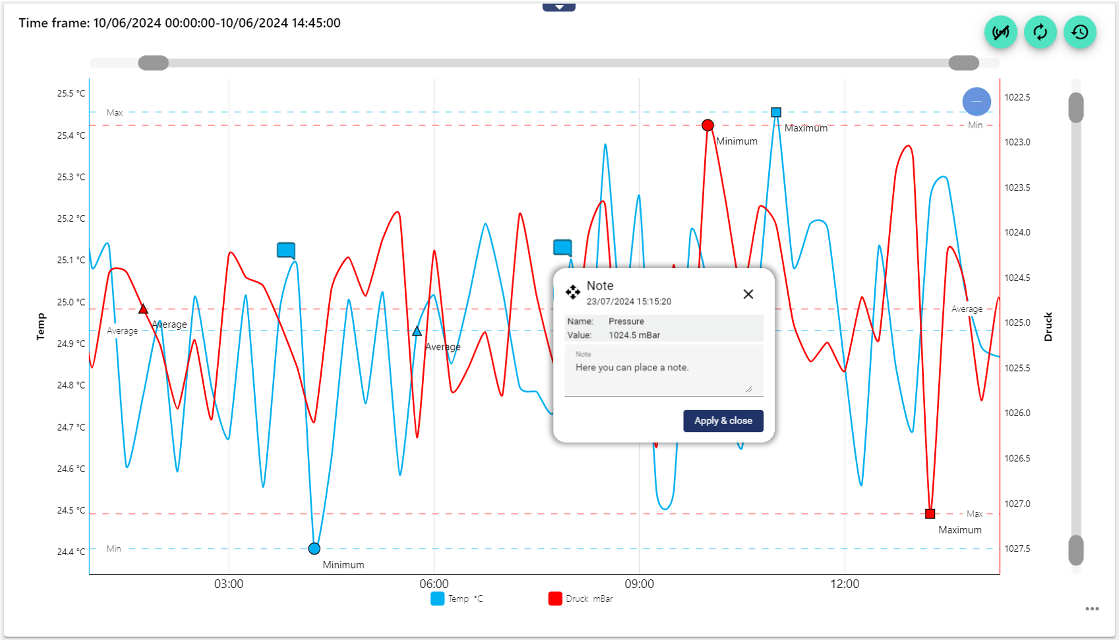 Anmerkungen können direkt im Diagramm eingegeben werden. Hierzu muss lediglich auf den Pfeil unterhalb des Tooltips geklickt werden. Diese Anmerkungen werden dauerhaft gespeichert und im Widget: Handeingabe als Kommentar sowie im Audit Log aufgeführt.
