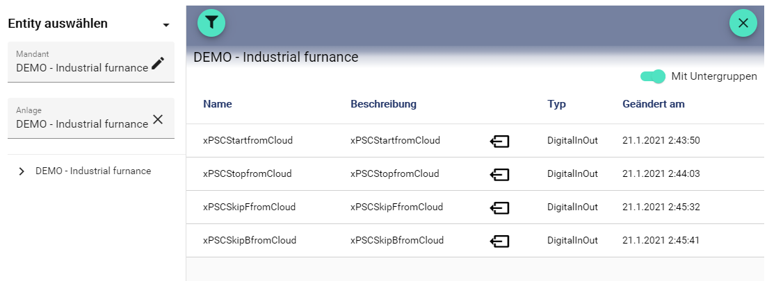 ![]() | Kann über “Signalhistorie verwenden” (siehe unten) eingestellt werden. Ermöglich es in Listenform einzusehen, wann welche historischen Einzelwerte im System gespeichert wurden. |
