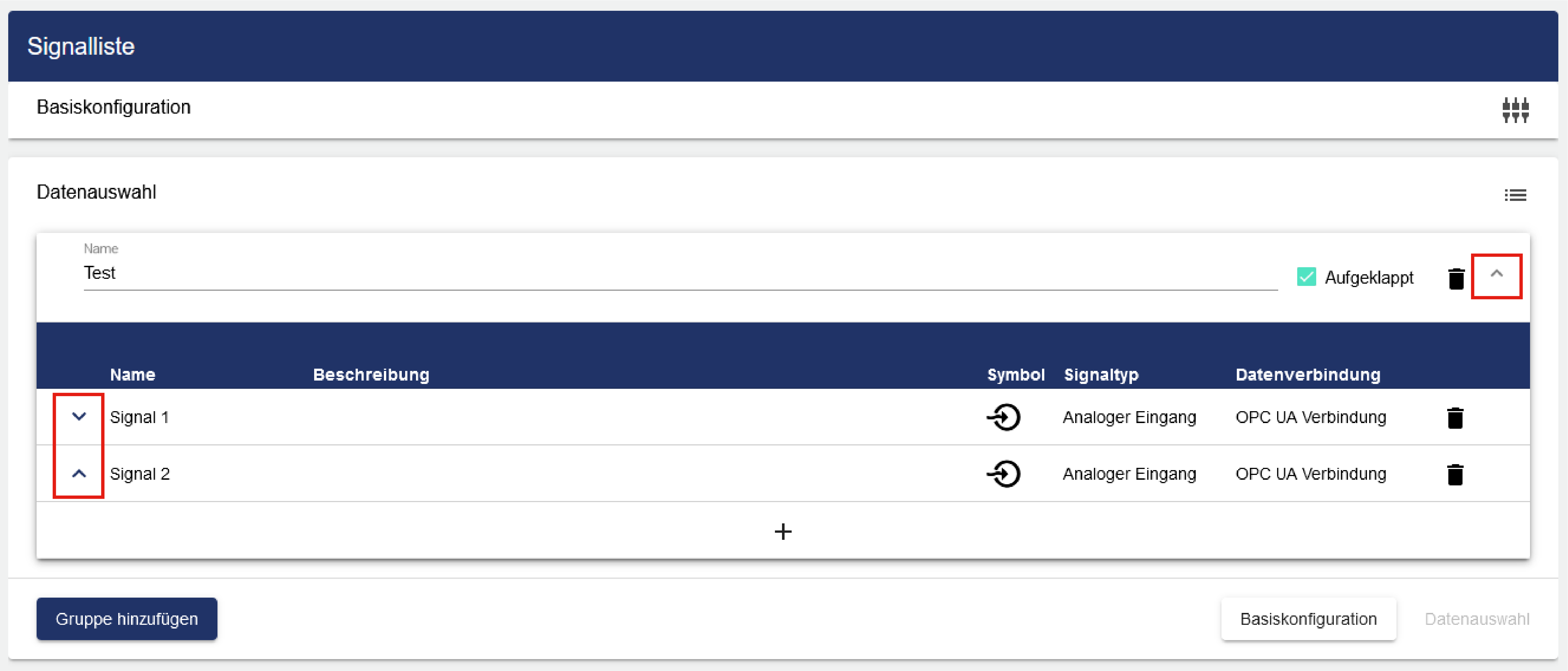 In der Datenauswahl können Sie über “Gruppe hinzufügen” eine oder mehrere Gruppe/n einfügen. Über die Pfeile kann man die Reihenfolge der Gruppen verändern. Diese werden dann gemäß der zuvor angelegten Reihenfolge sortiert. Der Namen ist beliebig. Mit dem Feld “Aufgeklappt” gibt man an, dass die Gruppe immer vollständig sichtbar ist oder reduziert dargestellt wird. Mit einem Klick auf die Zeile oder das Pfeilsymbol auf der rechten Seite wird die Gruppe manuell auf- oder eingeklappt.