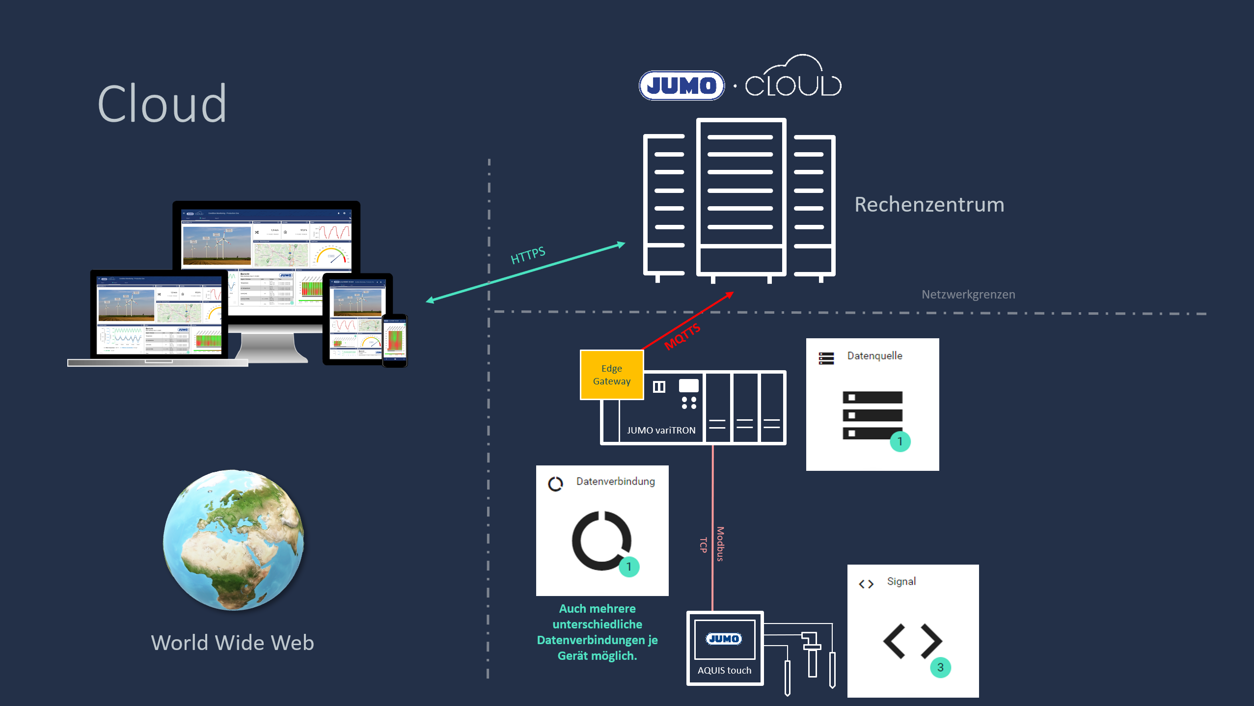 Hier sehen Sie, wie das Gerät der JUMO variTRON Familie mit der JUMO Cloud verbunden wird und Prozessinformationen im Dashboard dargestellt werden.