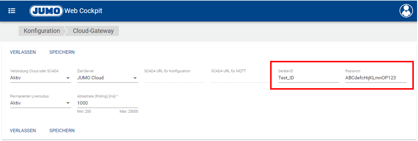 Im “JUMO Web Cockpit” des variTRON Gerätes unter Konfiguration und Cloud Gateway die Geräte-ID und Passwort aus der JUMO Cloud eintragen