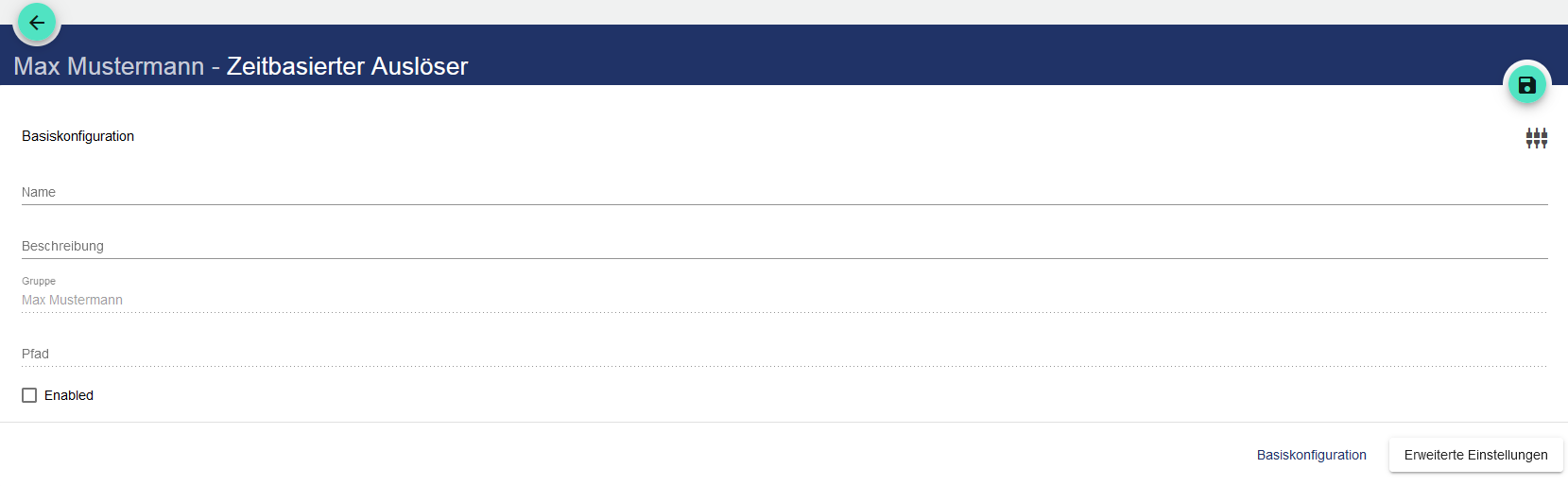 Name des zeitbasierten Auslösers in der Basiskonfiguration vergeben. Das Feld Beschreibung ist optional nutzbar. Das Feld “Gruppe” zeigt, in welchem Mandanten der Auslöser angelegt wurde. Der Pfad wird systemseitig automatisch generiert.