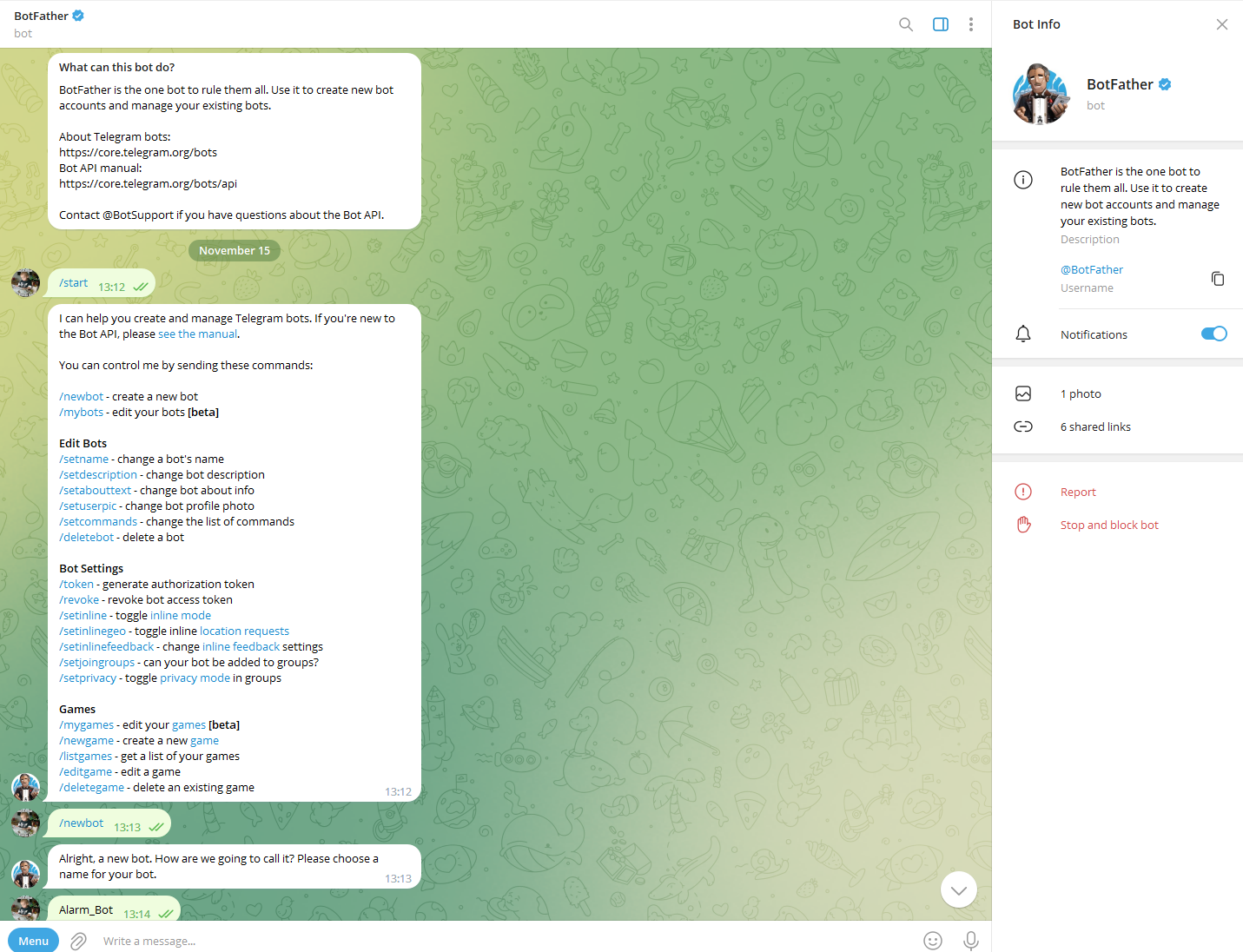 Der BotFather gibt Ihnen alle Informationen, die Sie brauchen, um Ihren Bot zu individualisieren.