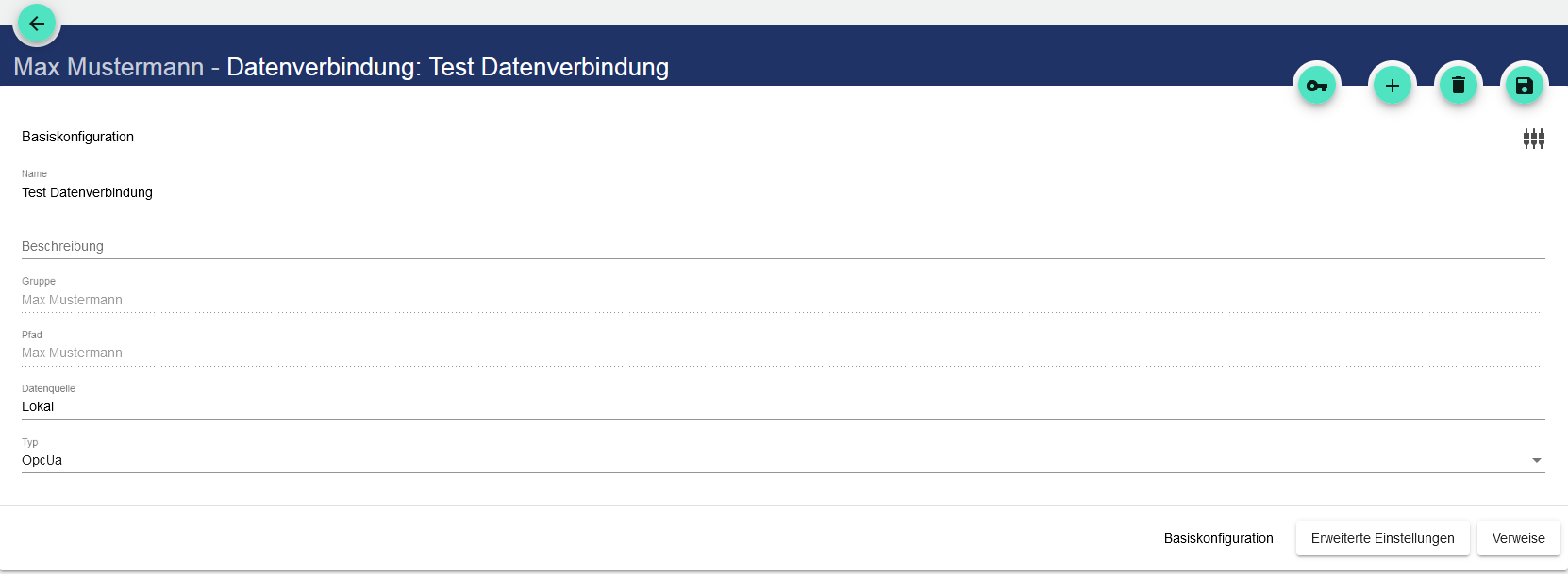Über die Auswahl der Schaltfläche “Datenverbindung” kann eine bereits angelegte Datenverbindung bearbeitet werden. Über das Plus wird eine neue Datenverbindung angelegt.