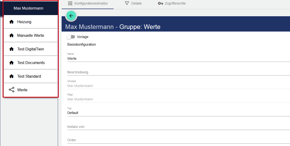 Eine Gruppe strukturiert den Mandanten. Die in der Konfiguration festgelegte Struktur gilt ebenso für Dashboards und Inbetriebnahme. Jede Gruppe beinhaltet alle Konfigurationselemente (Konfigurationsstruktur, Details, Zugriffsrechte)