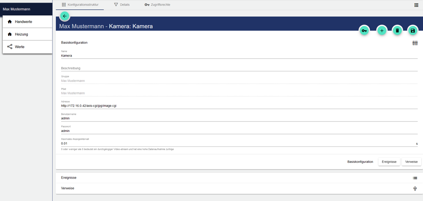 Über die Auswahl der Schaltfläche “Kamera” kann eine bereits angelegte Kamera bearbeitet werden. Über das Plus wird eine neue Kamera angelegt.