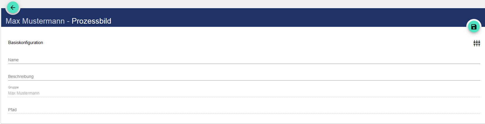 Name des Prozessbildes in der Basiskonfiguration vergeben. Das Feld Beschreibung ist optional nutzbar. Das Feld “Gruppe” zeigt, in welcher Gruppe das Prozessbild angelegt wurde. Der Pfad wird systemseitig automatisch generiert.
