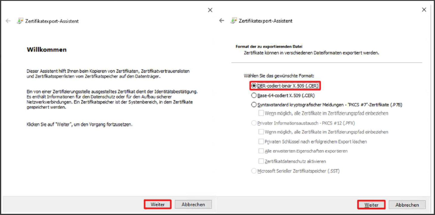 Klicken Sie auf "Weiter", wählen Sie nun "DER-codiert-binär X.509 (.CER)" als Datenformat aus und bestätigen Sie dies mit "Weiter"