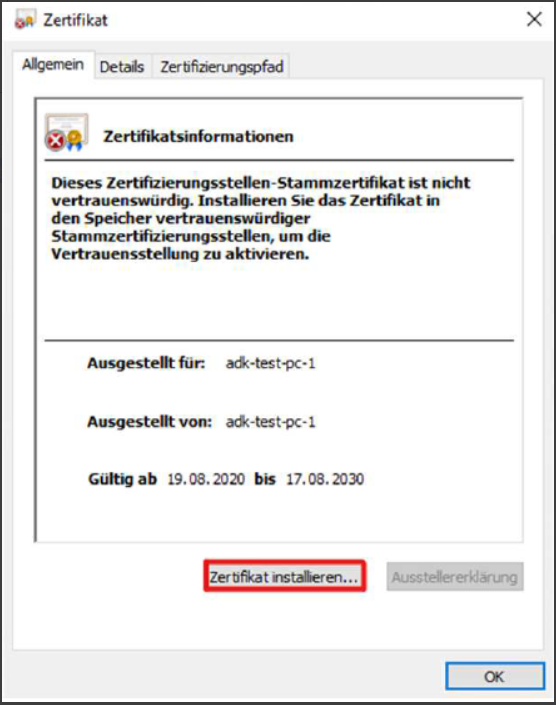 Gehen Sie nun an den von Ihnen ausgewählten Speicherort und öffnen Sie das Zertifikat indem Sie es anklicken. Wählen Sie nun "Zertifikat installieren..." aus.