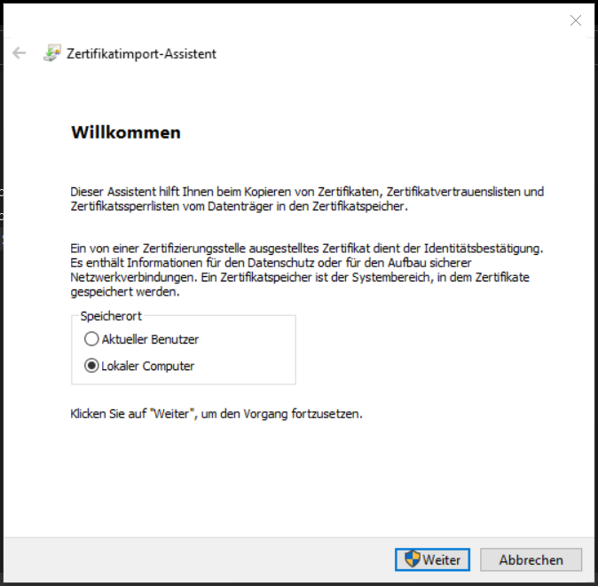 Wählen Sie als Speicherort den Lokalen Computer aus, oder Aktueller Benutzer wenn Sie keine Administrator Rechte auf Ihrem PC haben. (Lokaler Computer bietet lediglich den Vorteil, dass das Zertifikat auch für die Anderen Nutzer bereit steht, dies ist kein Muss!)