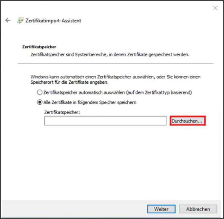 Wählen Sie "Alle Zertifikate in folgendem Speicher speichern" und klicken Sie auf "Durchsuchern...".