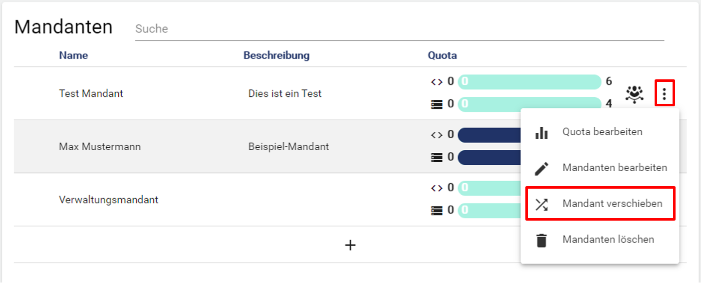 Mit dieser Option können Mandanten unter einen anderen Mandanten verschoben werden. Hierbei werden alle Benutzer und alle Elemente des Mandanten mit verschoben.