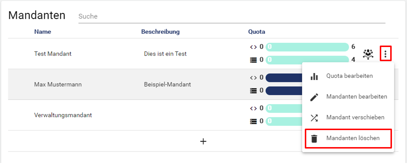 In diesem Bereich können die Maximum Quota für Untermandanten bearbeitet werden.