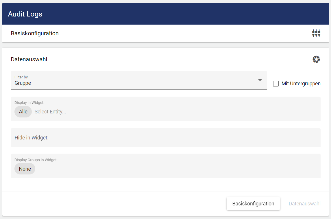 Im Widget Audit Logs werden alle Änderungen, die auch im Leitvorgangsarchiv angezeigt werden, im Widget darstellen. Zusätzlich gibt es die Möglichkeit unterschiedliche Konfigurationselemente und Gruppe von der Ansicht auszuschließen.