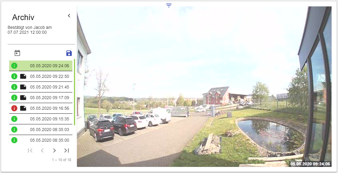 Mit Hilfe des Widget CameraArchive ist es möglich die über das Live-Bild gesicherten Aufnahmen anzuzeigen. Dafür muss eine Kamera angeschlossen werden, die ein Live-Bild (siehe auch Widget: Live-Bild) überträgt. Über das “Disketten”-Symbol wird ein Screenshot der aktuellen Kamera-Ansicht erstellt und ins Archiv aufgenommen. Für jeden Screenshot wird das Datum, die Uhrzeit und der Benutzer hinterlegt und angezeigt. Optional kann der Screenshot über das “i-Symbol” bestätigt werden. Sobald die Bestätigung erfolgt ist, wird der Kreis grün dargestellt. Ist der Kreis rot, so ist das Bild nicht bestätigt. Zusätzlich kann zum Screenshot noch eine Notiz hinterlegt werden. Ist eine Notiz hinterlegt, wird dies über das schwarze Dokumenten-Symbol angezeigt. Über einen Klick auf die Zeile öffnet sich ein Textfeld, indem Notizen hinterlegt und gespeichert werden können. Mit dem Kalender-Symbol kann man vergangene Archiv-Bilder aufrufen und einsehen. Es werden weiterhin alle Aufnahmen angezeigt, nur die Position auf den Seiten ändert sich.