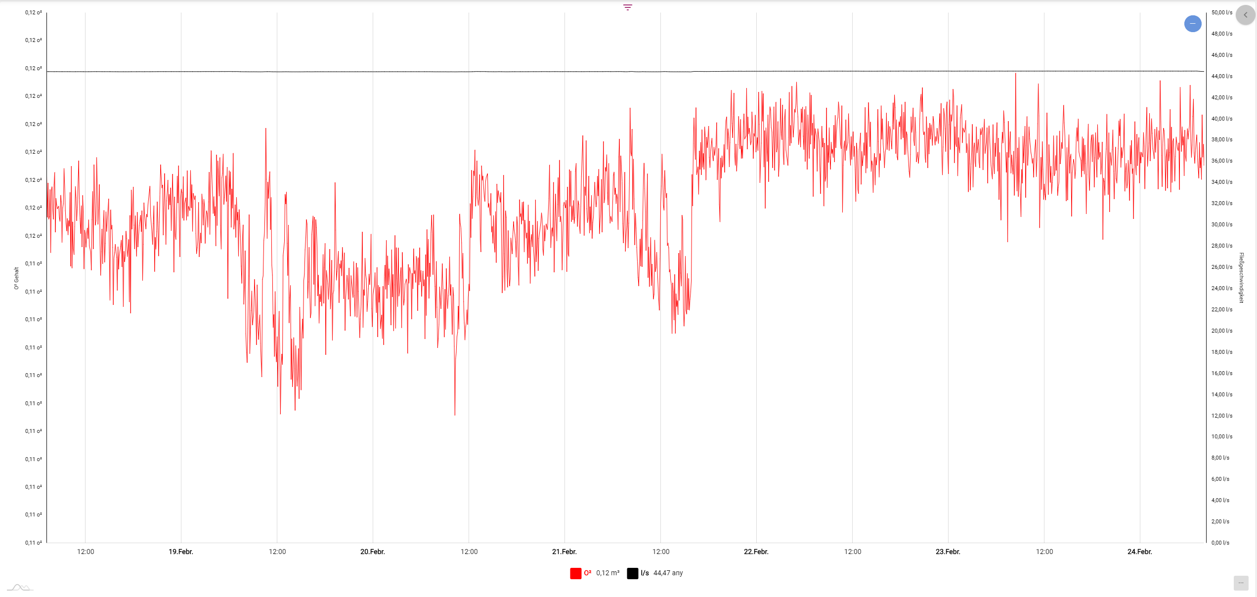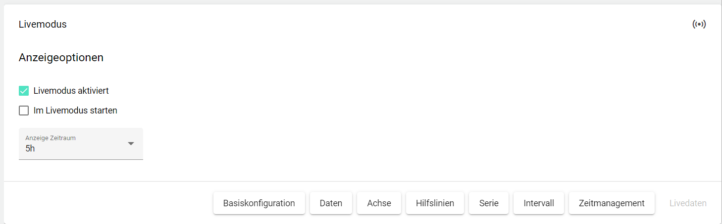 Ist der Livemodus aktiviert erscheint im Widget ein Symbol mit dem dieser im Widget angewendet werden kann. Anschließend wird lediglich der “Anzeige Zeitraum” (1h-24h) mit historischen Werten angezeigt, zusätzlich erscheinen die Live-Werte des IoT Gerätes.