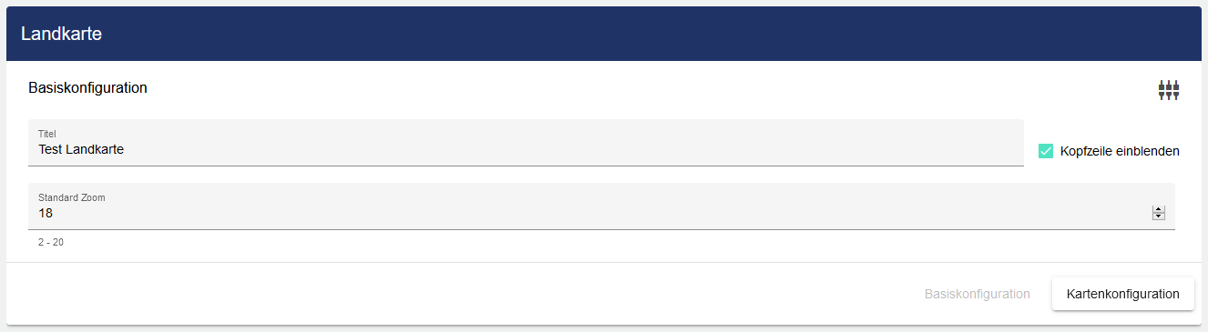 In der Basiskonfiguration der Landkarte vergeben Sie einen geeigneten Titel. Durch die Auswahl des Hakens kann die Kopfzeile eingeblendet werden. Der Standard Zoom gibt den Zoomfaktor (2 - 20) an, in der die Landkarte nach Start des Widget angezeigt wird. Je kleiner der Angabe desto weiter wurde rausgezoomt. Der Zoom kann durch das Mausrädchen variabel verändert werden.
