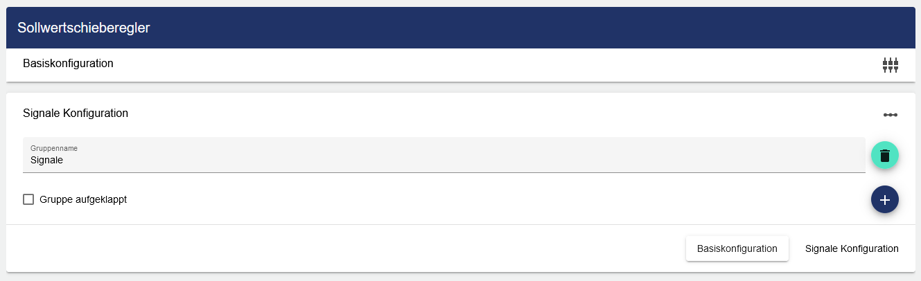 In der Basiskonfiguration des Sollwertschiebereglers vergeben Sie eine geeignete Beschriftung (Titel). Durch die Auswahl des Hakens kann die Kopfzeile eingeblendet werden. Ebenfalls müssen Sie einen Gruppennamen hinzufügen. Über das „+“ Icon erstellt sich die zugehörige Konfiguration der Gruppe.
