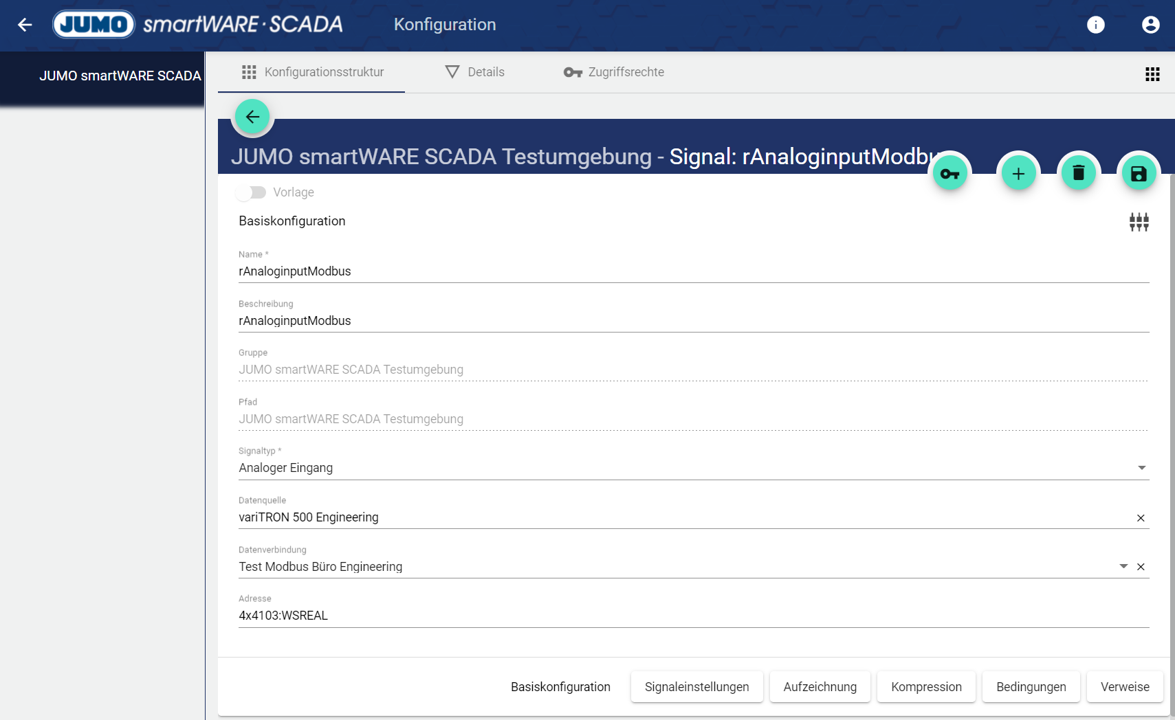 Modbus TCP (Mit dieser Datenverbindung ist es ganz einfach und ohne JUMO Setup / Codesys möglich, Signale eines Gerätes (z.B. Aquis Touch, etc.) abzurufen und an die Cloud weiter zu leiten.) Um diese Datenverbindung zu wählen bitte im Kapitel Datenverbindung nachlesen. (Im Cloud Gateway des variTRONs ist ein Modbus Master integriert). Wie anschließend Signale angelegt werden ist im Kapitel Signal beschrieben.