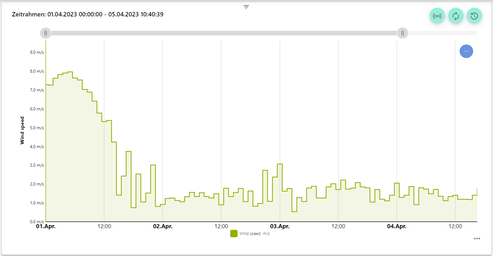 12.) Die Zentrale Zeitsteuerung wurde überarbeitet und optimiert. Nun lässt sich mit dem bekannten “Zeitmanagement” ein Kanal auswählen, um alle gewünschten Widgets: Analysis zu steuern. Im unteren Beispiel wurde mit einem Klick die Zeitspanne aller Widgets gesetzt. Somit kann der Zeitbereich vom 03.04. bis 05.04 einfach und schnell ausgewertet werden.