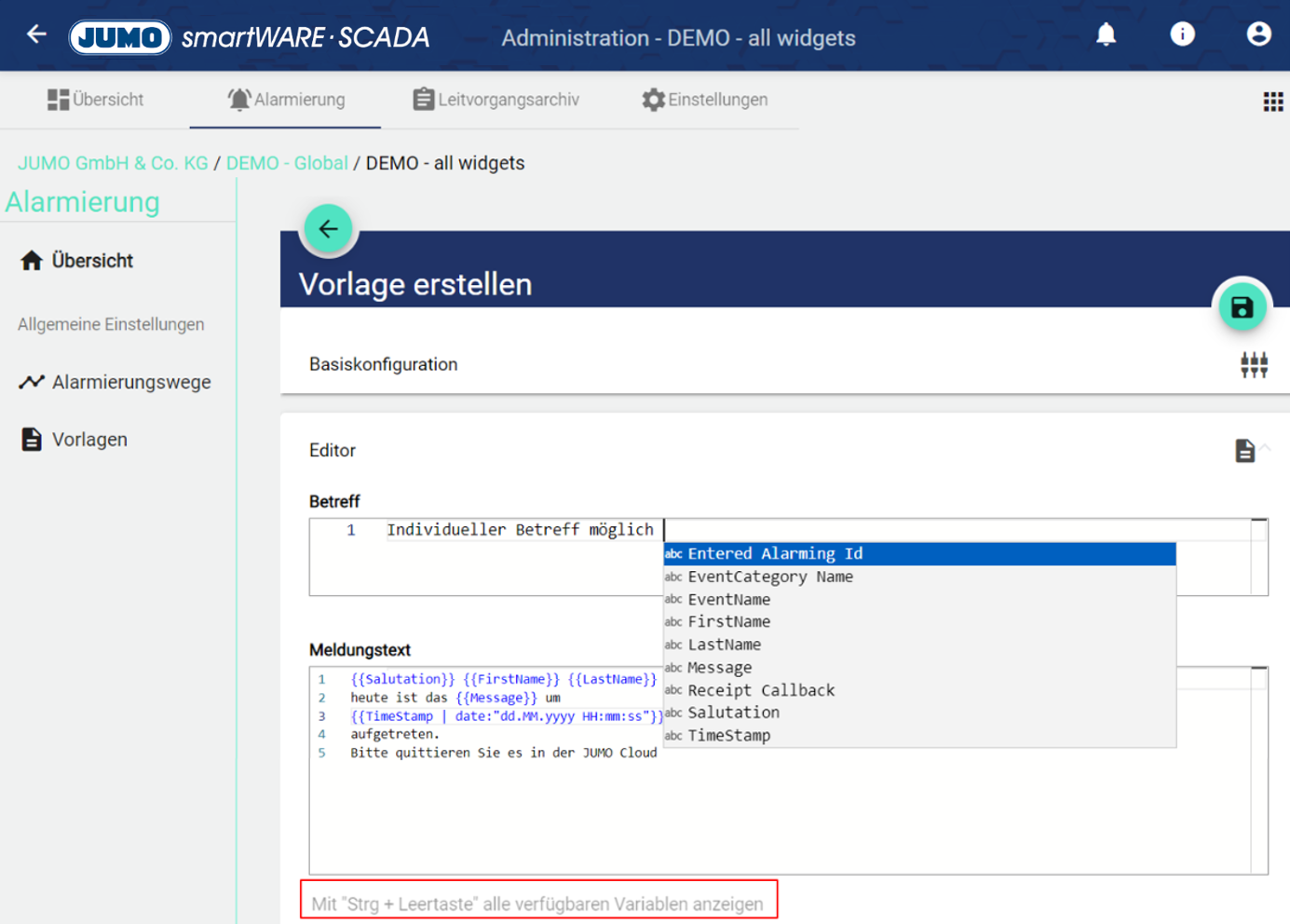 6.) Aktuell wird bei der Alarmierung per “Mail” im Default immer die Ereigniskategorie im Betreff versendet. Mit dem neuen Feature lässt sich der Betreff individuell durch die Verwendung von Mail-Vorlagen anpassen. Es können alle üblichen Variablen verwendet werden, u. a. auch das auslösende Ereignis.