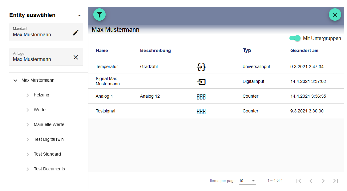 Über das “Filter”-Symbol kann man einen Signalnamen oder eine Beschreibung als Suchbegriff eingeben. Durch das Setzen des Haken “Mit Untergruppen” werden alle weiteren Untergruppen angezeigt.