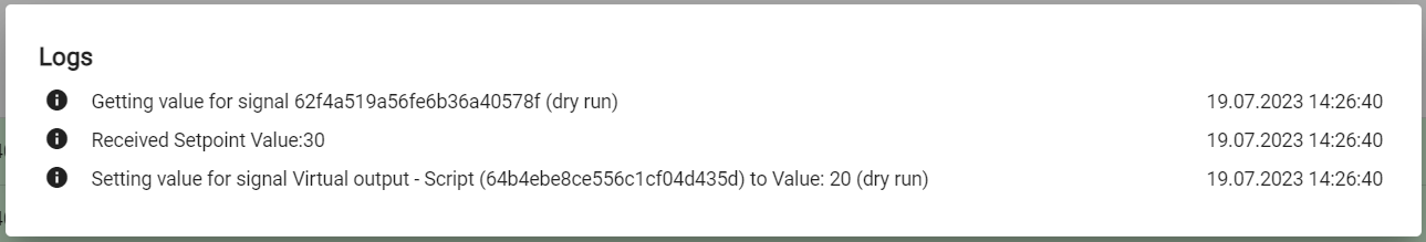 Über die Buttons “Testen” und “Ausführen” kann das Skript manuell ausgeführt werden. Diese manuellen Aktionen werden erfasst und im Reiter “Historie” geloggt. Ein Klick auf “Testen” erzeugt einen “Dry Run” in der Historie. Hierbei werden keine Sollwerte gesetzt, Chargen gestartet bzw. gestoppt oder Kamerabilder ins Archiv gelegt. Unter Historie kann der Anwender jedoch berechnete Werte oder Skript-Feedback einsehen. Ein Klick auf “Ausführen” führt das Skript vollständig aus.